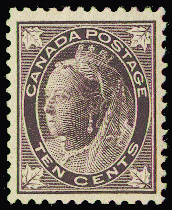 #73, 1897 10c Brown violet Maple Leaf, exceptional centering, stunning deep color, pristine never hinged gum, a choice example of this difficult key value, very fine. (Unitrade C$2,400)