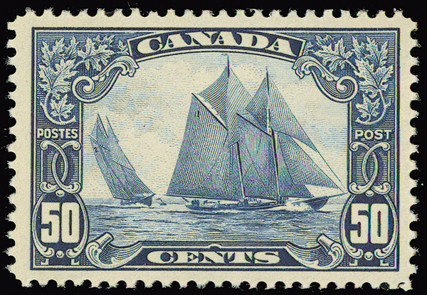 #158, 1929 50c Dark blue Bluenose, fresh appearance, well-centered, hinged, very fine. (Unitrade C$350)