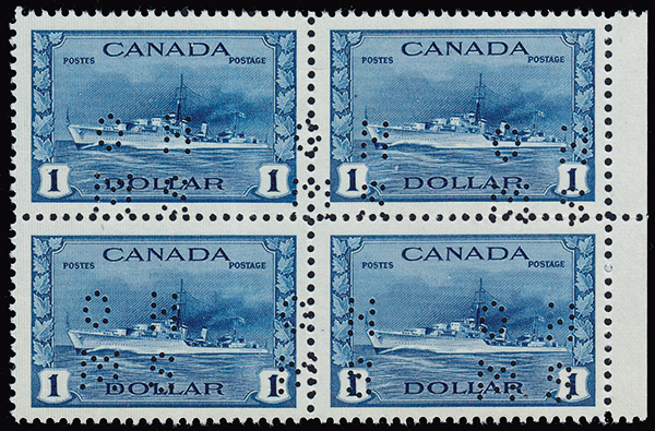 #O249-62 1942-3 War Issue 4-Hole O.H.M.S. perfins, post-office fresh color, typically hinged between the top to stamps, the 50c with small hinge thin, attractive and very fine. (Unitrade C$1,020 as hinged).