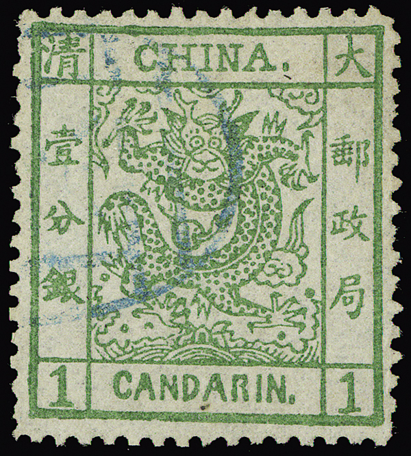 #1, 1878 1ca Large Dragon on thin paper, neatly-struck blue postmark, choice centering, very fine.