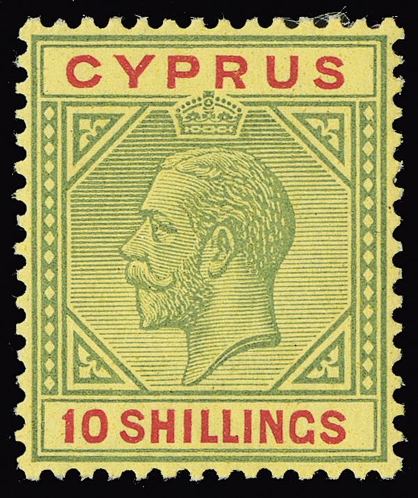 #87, 1923 10/- Green and red on yellow, lightly hinged, rich color, balanced margins, very fine. (S.G. #100; £750).