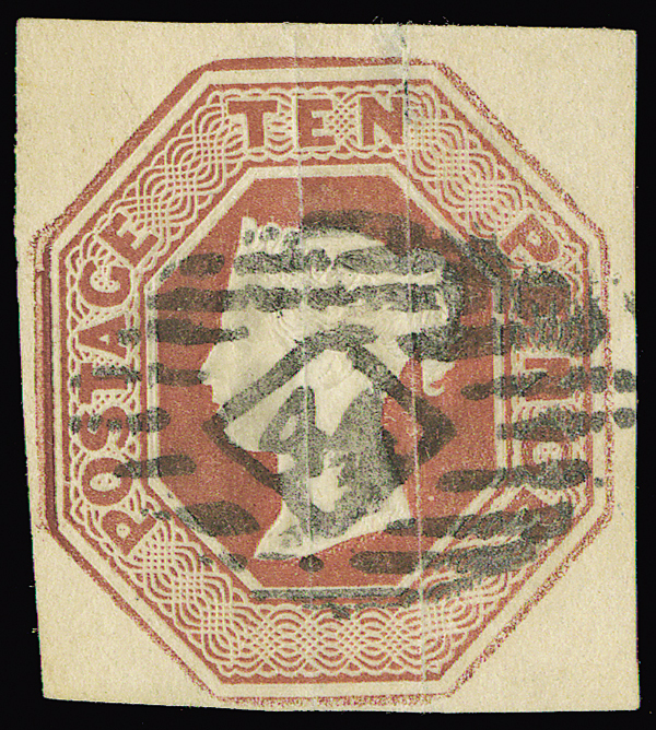 #6, 1848 10d Red brown, four clear to large margins, centrally-struck #44 postmark, some fragility to right-most silk thread, fine. (S.G. #57, £1,500)