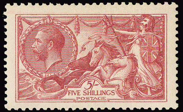 #174, 1913 5/- Rose carmine Seahorse, lightly hinged, superbly-centered within large margins, striking vibrant shade, very fine. (S.G. #401, £625).