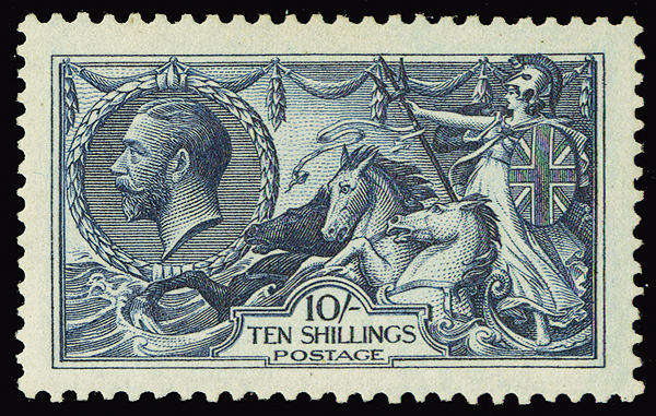 #175, 1913 10/- Indigo Seahorse, exceptional centering, lightly hinged, beautiful deep color and proof-like impression, extremely fine. (S.G. #402, £1,200)