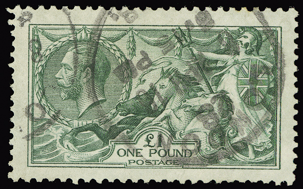 #176, 1913 £1 Green Seahorse, wonderfully-centered, large even margins, deep color and precise impression, centrally-struck London c.d.s., very fine. (S.G. #403, £1,400)