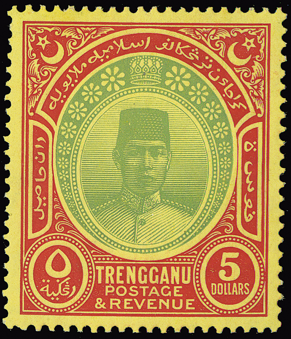 #38, 1938 $5.00 Red and green on yellow, almost imperceptible hinge mark, brilliant bright color, perfectly centered, very fine. (S.G. #44, £500)