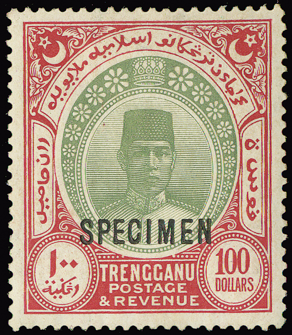 #41, 1921-8 $100 Red & green, overprinted "Specimen" in black, superior centering, bright color, very fine. (S.G. #47s, £1,100)