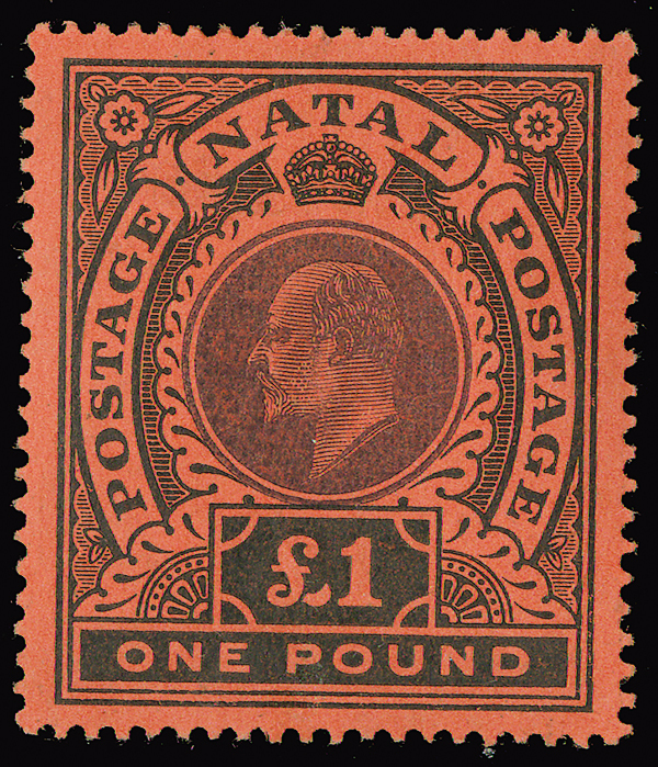 #116, 1908 £1 Black and violet on red,, brilliant color, incredibly well-centered, lightly hinged, an exceptional example of this key value, very fine. (S.G. #171; £325).