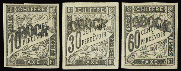 #J2-4 1892 10c-60c Black, hinge remnants, all four margin examples, the 10c value slightly toned, each with at least one expert handstamp or signature, an uncommon group, very fine.