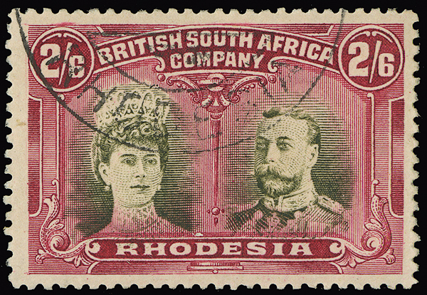 #113, 1910-13 2/6d Crimson and black, beautiful bright color, neatly-struck c.d.s. postmark at top, well-centered, very fine, with 1983 Brandon certificate. (S.G. #156, £325).