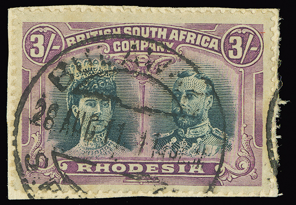 #114var, 1910-13 3/- Bright green & magenta, used on piece with clear "Bulawayo 28. AUG. 11" c.d.s., bright color, very fine, with 1979 Brandon certificate. (S.G. #158a, £850).