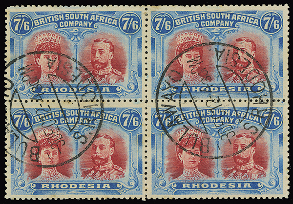 #116, 1910 7/6 Bright blue and carmine, a beautiful block of four, postmarked with two neatly-struck "Bulawayo 3DEC12" circular datestamps, choice centering and brilliant bright color, trivial mark in top margin, a lovely block in this scarce shade, very fine. (S.G. #162, £5,600)