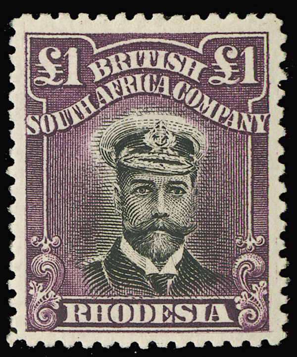 #138, 1913 £1 purple and black King George V, lovely deep shade, exceptional centering, hinged with small rose owners mark on gum, very fine. (S.G. #242, £425)