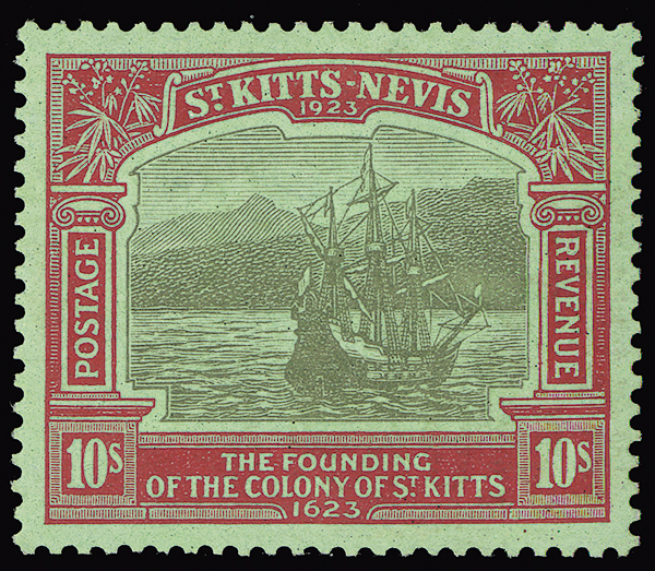 #62,1923 10/- Red & black on emerald, hinged, beautifully-centered, appealing color, very fine. (S.G. #58, £325).