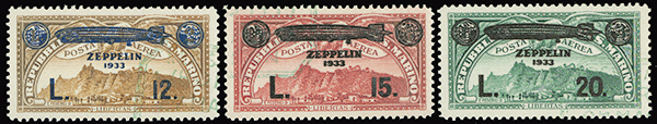 #C11-16, 1933 3l on 50c to 20l on 3l Graf Zeppelin, a fresh used set, postmarked with unobtrusive green corner cancels, bright colors, select centering, very fine.