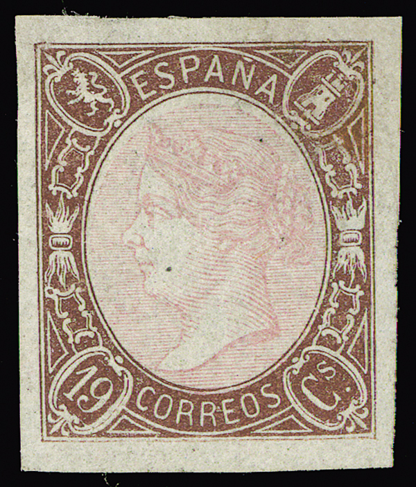#70, 1865 19c Brown & rose, four large margins, faint trace of postmark, appears unused, two small spots on face, deep color, very fine.