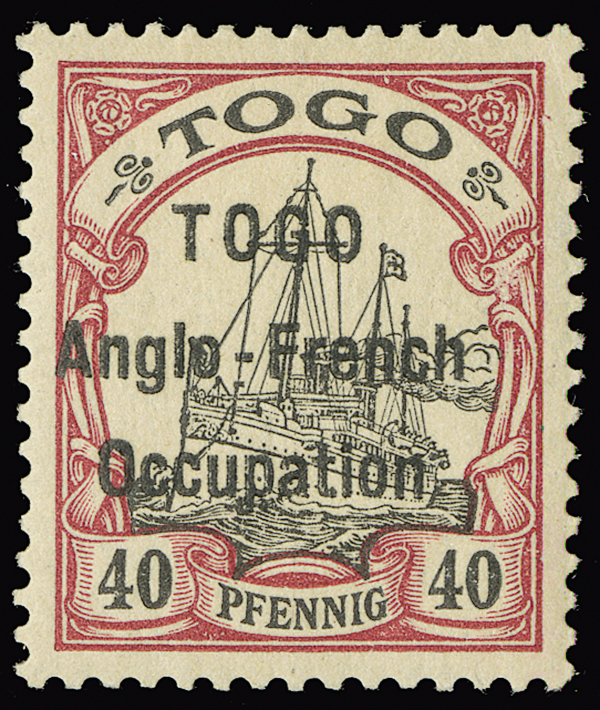 #41, 1914 40pf Lake and black, first (wide setting) overprint, lightly hinged, with multiple expert marks, bright fresh color, very fine. (S.G. #H7, £225).