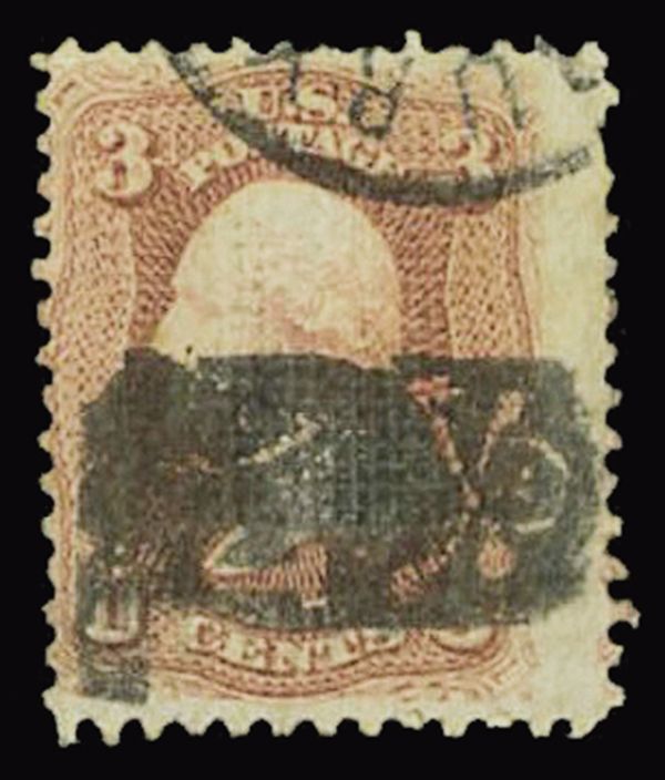 "AJ" on Tombstone (Rohloff R-5), full strike on 3c Red (94), showing partial Waterbury c.d.s., stamp centered to the left, the postmark with clear "A.J." and skull & crossbones, a dramatic and very fine fancy cancel; with 1994 P.F. certificate.