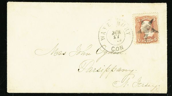 Five-Point Star, Type 3 (Rohloff S-3), centrally-struck on 3c Rose (65), on cover to Parsippany, New Jersey, stamp just tied by "Waterbury Con Jun 17 1868" double circle, a choice example of this rare cancellation.