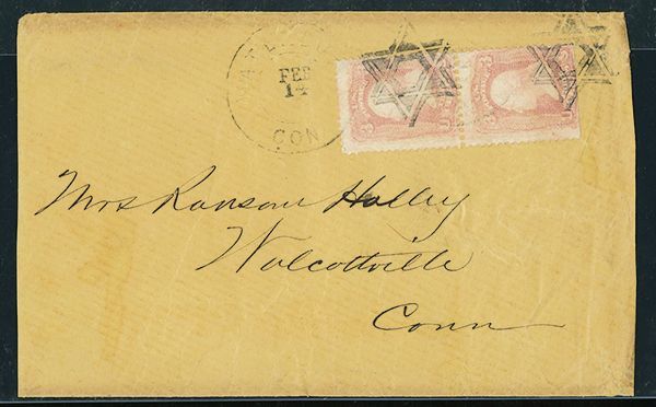 Six-Point Star, Type 1 (Rohloff S-5), two strikes tie 3c Rose (65) vertical pair, scissor separated at bottom, on cover to Walcottville, Connecticut, one stamp further tied by Waterbury Con Feb 14 double-circle, reduced on either side and small faults, yet a scarce usage of this fancy cancel; ex Mattatuck Historical Society,