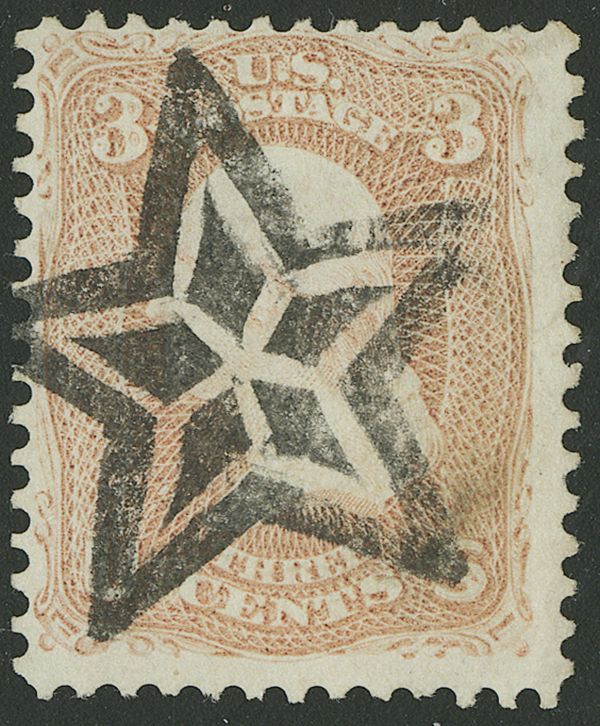 Star Within a Star (Rohloff S-6), choice centrally-struck cancellation on 3c Rose (65), stamp fresh and fine, minor pulled perf and reperforated at left, a beautiful-looking example, rare, very fine appearance; with 2020 P.F. certificate.