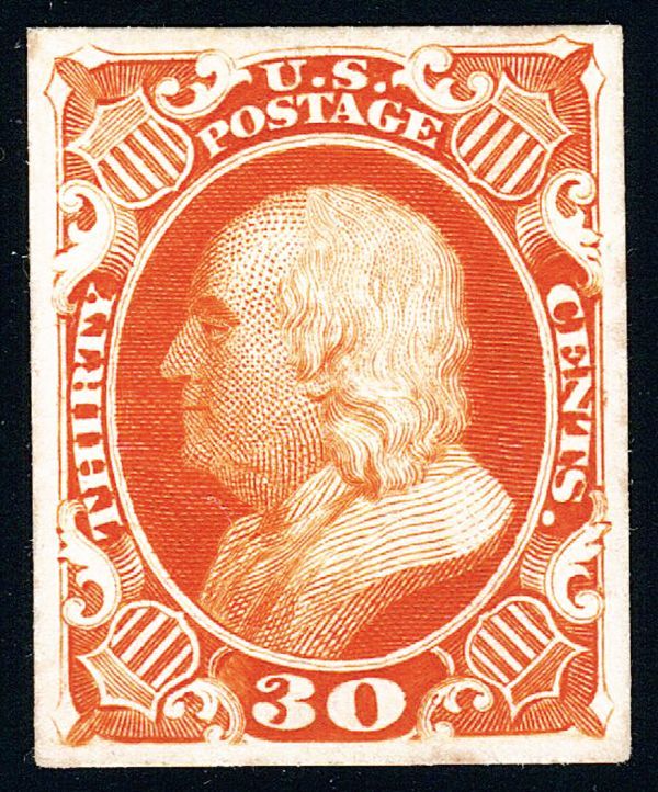 30c Orange plate proof on card-mounted India paper, four large balanced margins, rich color, some negligible spots around outer edges, a scarce proof, centered very fine. (Sc. 38P3, $1,250)