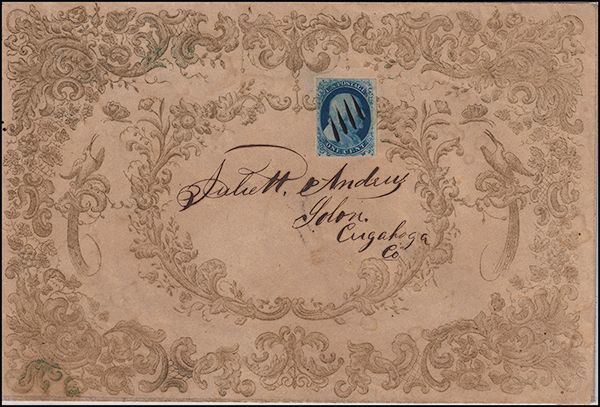 1851 1c Blue, Type II, with ample to large margins, rich color, neatly-cancelled in manuscript on large all-over front and back Valentine's cover, approximately 200x135mm, attractive and ornate bronze-colored bird and floral motif, attractive and very fine. (Sc. 7)