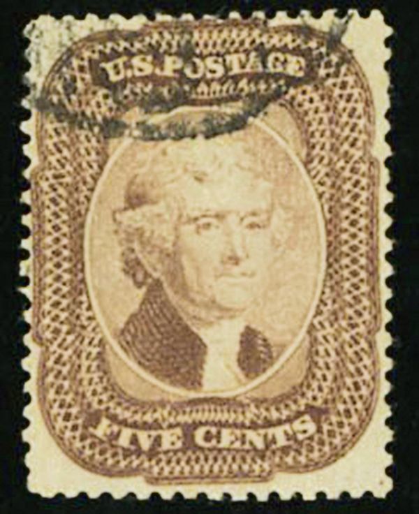 1859 5c Brown,Type I, bright color, unobtrusive small part circular datestamp at top, well-centered for this challenging and notoriously tightly-spaced issue, very fine; with 1993 P.F. certificate (Sc. 29, $350)