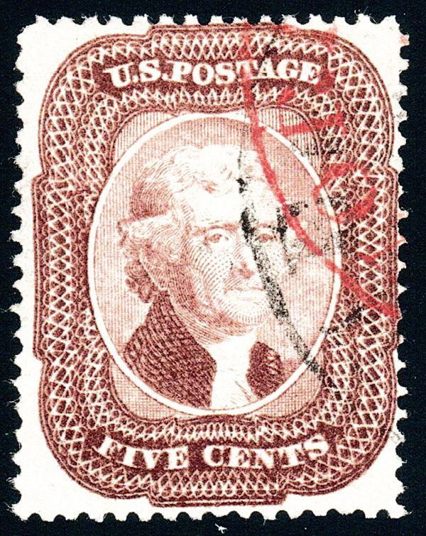 1859 5c Brown, Type I, bright color, neat partial black and red postmarks, well-centered for this challenging issue, pencil signed on back, fine-very fine. (Sc 29, $350)