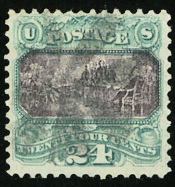 1869 24c Green & Violet, well-centered and bright color, detailed impression with well-defined grill, centrally-struck rosette cork cancel, very fine. (Sc. 120, $600)