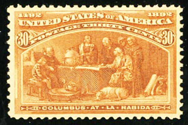 1893 30c Columbian, never hinged, pleasing shade, select centering, very fine; with 2006 P.S.E. certificate for a block of four, from which this is the lower left stamp. (Sc. 239, $675)
