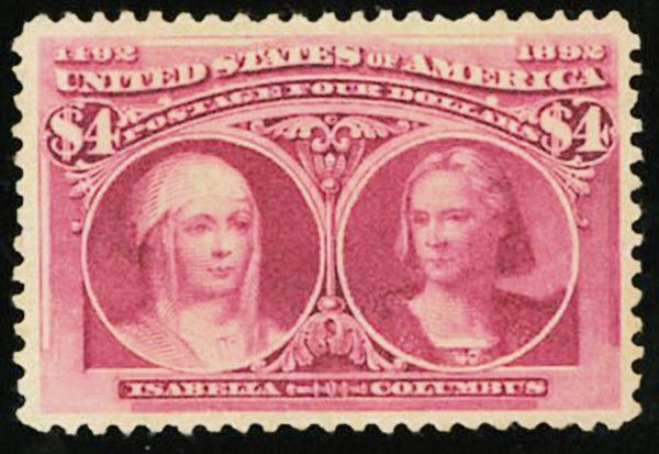 1893 $4.00 Columbian, unused, no gum, pleasing shade, desirable centering, very fine; with 2009 P.S.E. certificate, graded VF-XF 85. (Sc 244, SMQ $1,150)