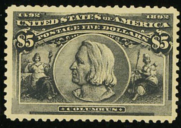 1893 $5.00 Columbian, unused, no gum, precise impression, select centering, very fine; with 2013 P.S.A.G. certificate graded 90J. (Sc. 245, $1,150)