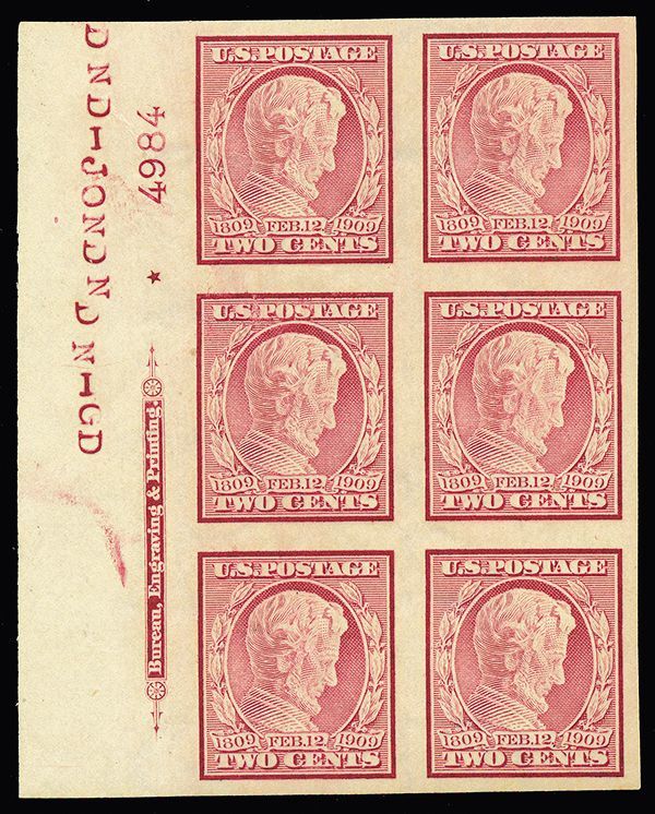 1909 2c Carmine, never hinged imprint and star imperforate No. 4984 left plate block of six, very fine, large margins, very fine. (Sc. 368, $390)