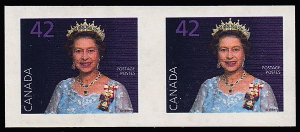 1991 42c Queen Elizabeth II imperforate pair, Ashton Potter printing, GT4, never hinged, very fine and scarce. (Unitrade #1357b, C$1,000)