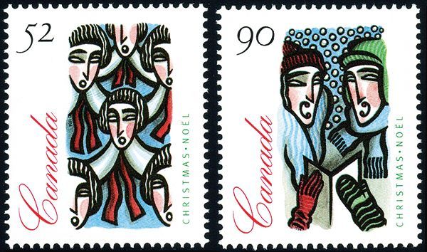 1994 52c & 90c unissued Christmas Caroling, never hinged, printed in preparation for a proposed rate increase that failed to be approved by Parliament, very fine. (Unitrade #1534ii, 1535ii, C$800)