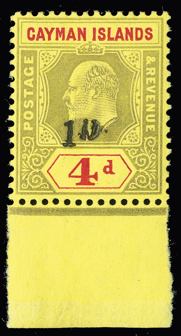 1908 "1d on 4d" King Edward VII revenue surcharge, hinged, lower sheet margin example, bright fresh appearance, uncommon and very fine.