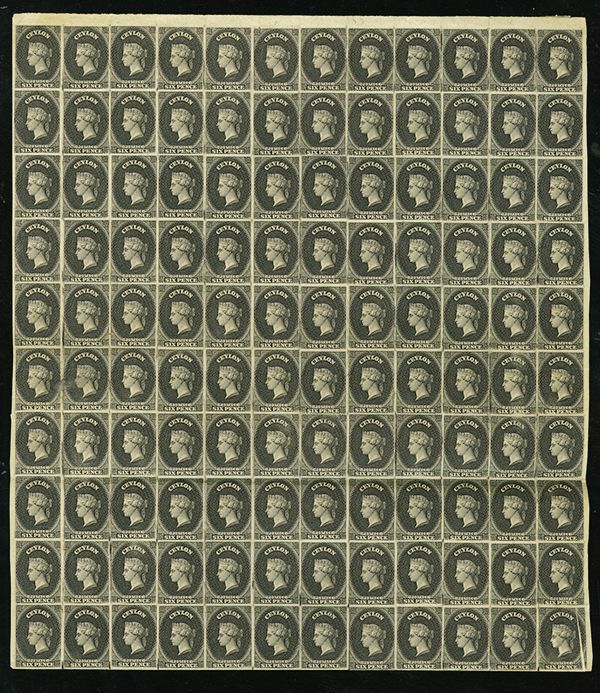 1857-9 6d plate proof in black on wove paper, large part-pane of 120, from the top of the sheet, precise impression and bold appearance, folded lightly through row six, between rows seven and eight, and between columns one and two, pre-printing paper crease to proof and lower right, a few insignificant corner creases and wrinkles of no importance given the significant rarity of multiples of this size, a beautiful item for the specialist, fine and rare.