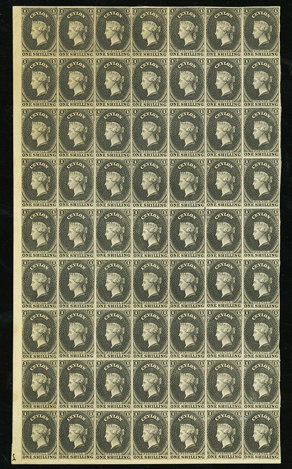 1857-9, 1/- plate proof in black on wove paper, block of sixty three from the left side of the sheet, lightly folded between rows four and five, exceptional detailed impression and striking appearance, rarely seen in multiples of this size, exceptional eye appeal, and very fine.