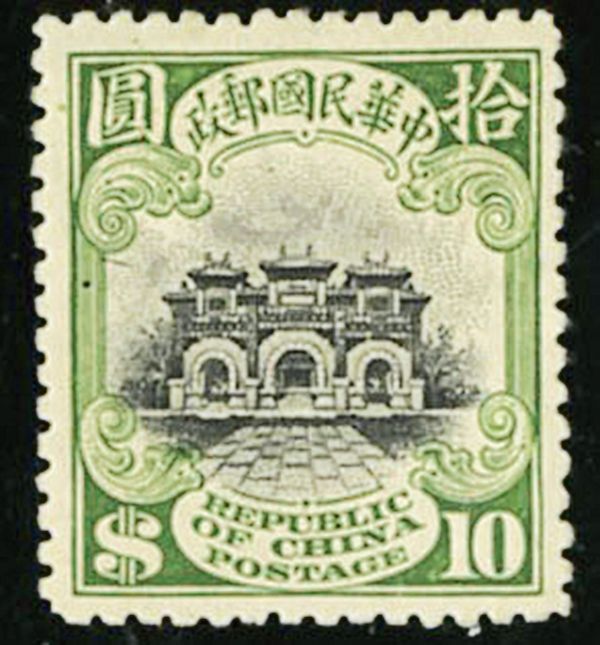 1913 $10.00 Yellow Green & Black, London Printing, hinge remnant, beautifully-centered, bright color, pencil notations on gum, fresh and very fine. (Sc. 220, $1,500)