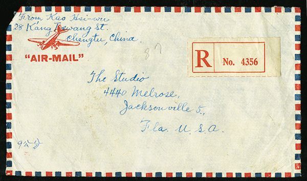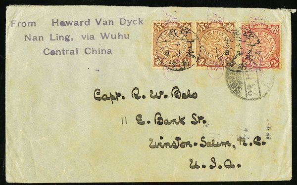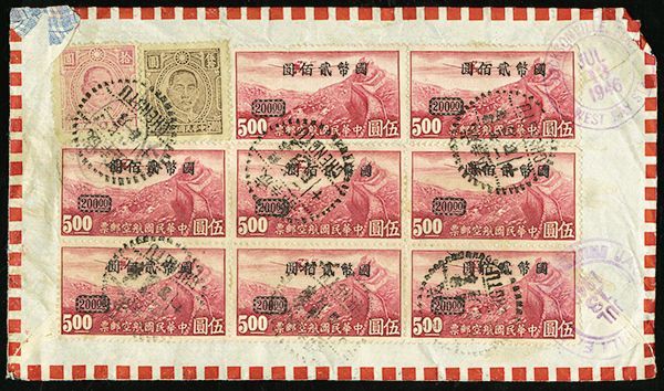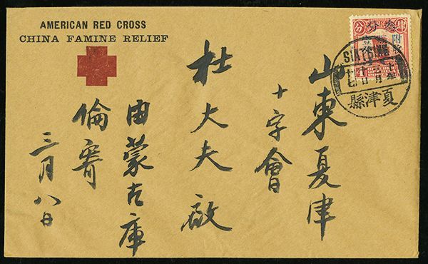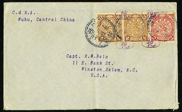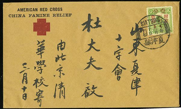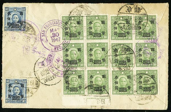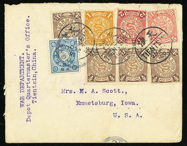 1900/1947 postal history group of ten, with 1900 mixed Coiling Dragon and Kikumon issue of Japan franking on War Department Tientsin cover to USA, two 1907 Coiling Dragon covers to North Carolina, USA, group of three 1920 Famine Relief semi-postal set of three covers with Siatsing c.d.s., and 1946/47 multiple-franking registered airmail covers from Chengtu to Florida; mixed condition with some creasing or small tears, but a desirable and interesting group.