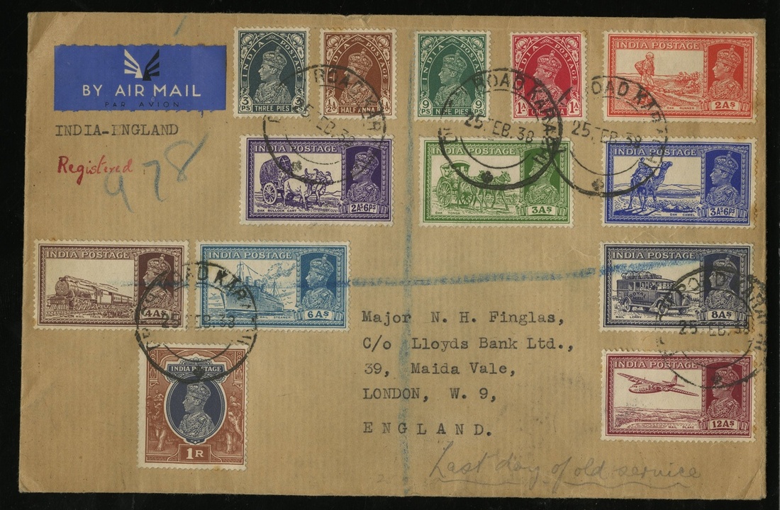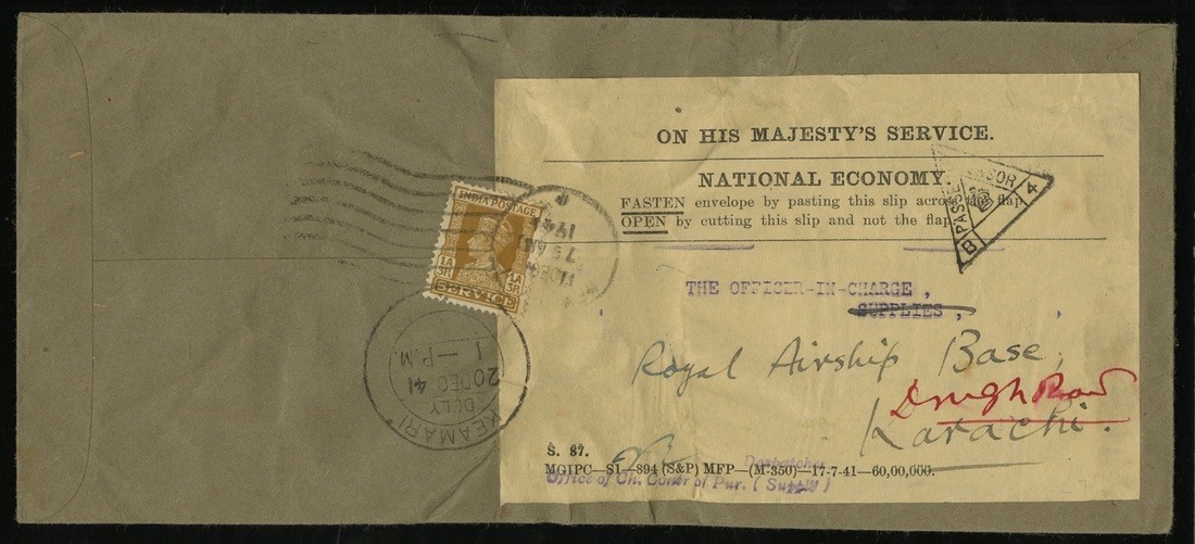 one franked with 1a3p KGVI, tied by New Delhi machine cancel (17 Dec), to the Officer in Charge, Royal Airship Base, Karachi, “Drigh Road” written above in red, with Karachi Airport (21 Dec) and Drigh Road (21 Dec) c.d.s. backstamps, some wrinkling, the second a multi-franked registered cover with 3p to 1r King George VI issues tied by Drigh Road (25 Feb) c.d.s., to London, endorsed “Last Day of Old Service”, a nice pair.