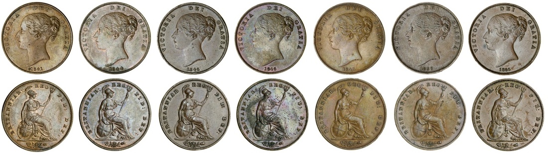 Victoria (1837-1901), Pennies (7), 1841 no colon, 1844, 1846 (2), 1848, 1853 and 1855, all with ornamental trident, young head left, rev. Britannia seated (S.3948), some residually lustrous, others spotted, otherwise generally good very fine tor better (7)