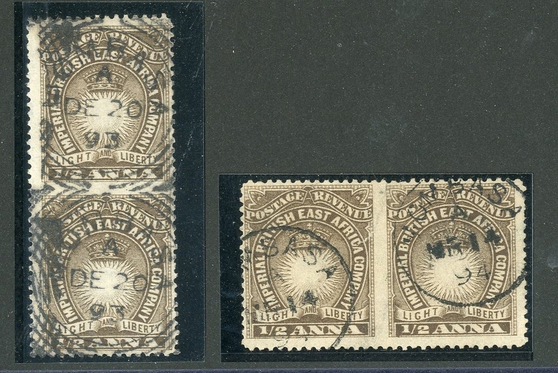 1890-95 ½a. dull brown, imperforate pairs (2), the first imperforate vertically and cancelled with triple ring squared circle Mombass d.s., the second an imperforate horizontally (closed vertical tear between the stamps) and lightly cancelled by crisp Mombassa c.d.s. S.G. 4bb, 4bc, £1,150
