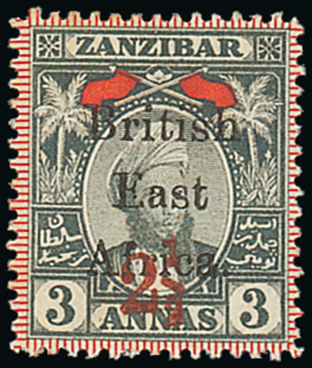 1897 2½a. on Zanzibar 3a. grey and red, special U.P.U. printing with stop after "Africa" and diagonal fraction bar, original gum; some staining though of fine appearance and very rare. See footnote after S.G. 91. Photo