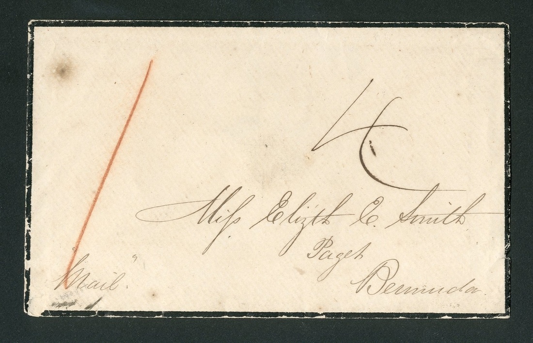 1861 (July) mourning envelope (small imperfections) from Demerara to Bermuda, per Thames to Barbados, Teviot to St. Thomas and per Cunard Delta to Bermuda, rated "1" in red crayon and "4", with faint despatch and St. Thomas (29.7) on reverse
