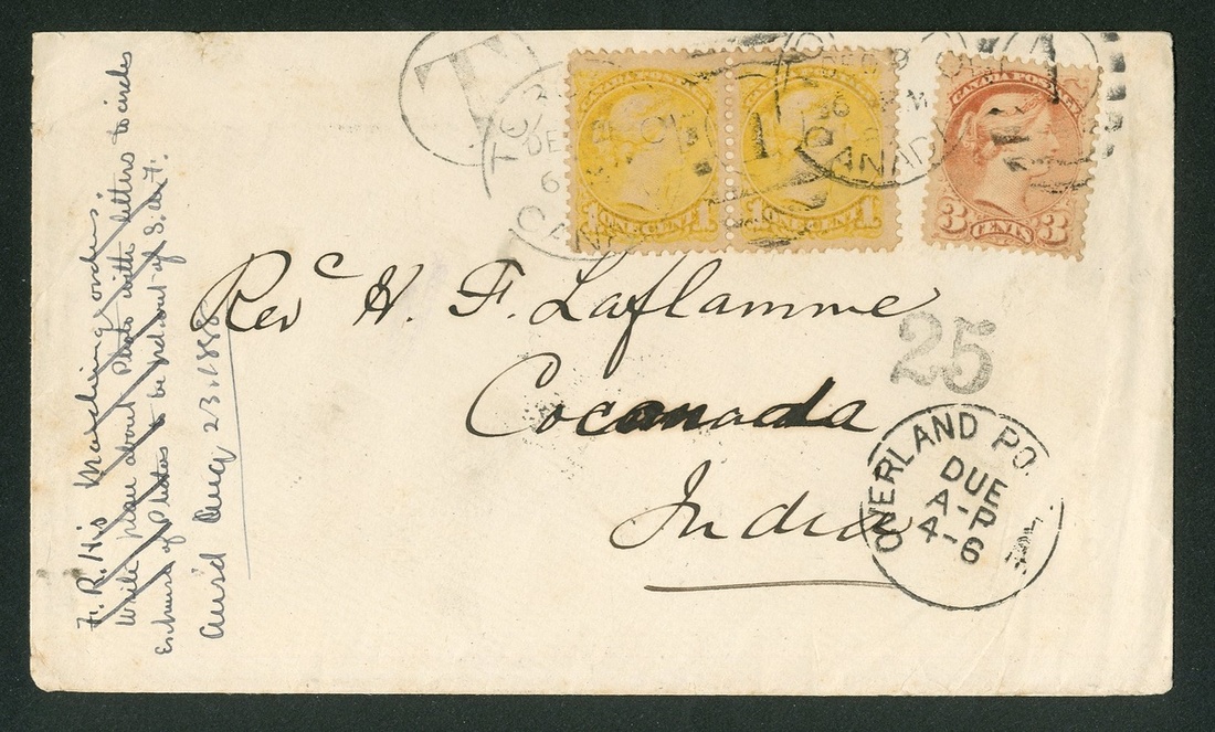 1887 (Dec.) envelope from Toronto to Cocanada, India, bearing Small Queen 1c. pair and 3c. cancelled with "1" duplex and showing circular-framed "