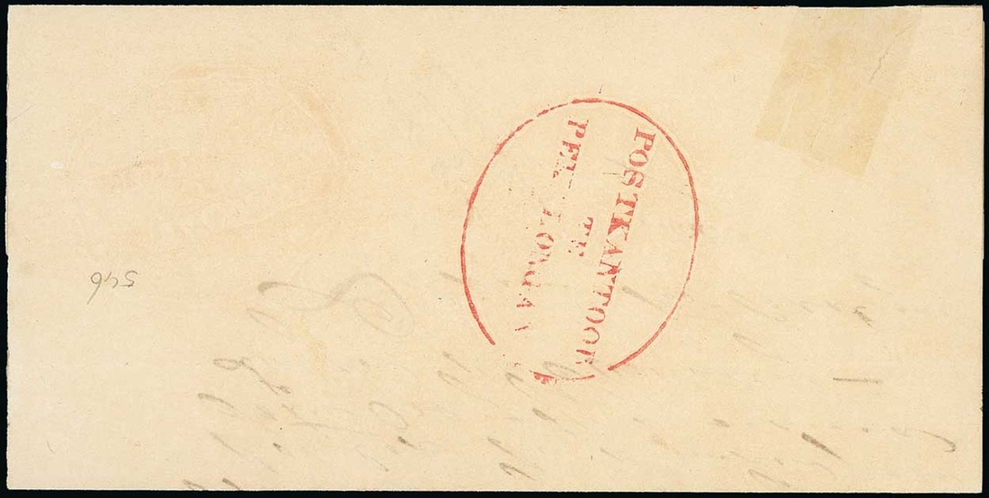 1858 (May) form with strikes of the red "Postkantoor/Te/Pekalongan" (Wolff de Beer 237) on front and reverse; tear clear of the handstamps. Rare. Photo