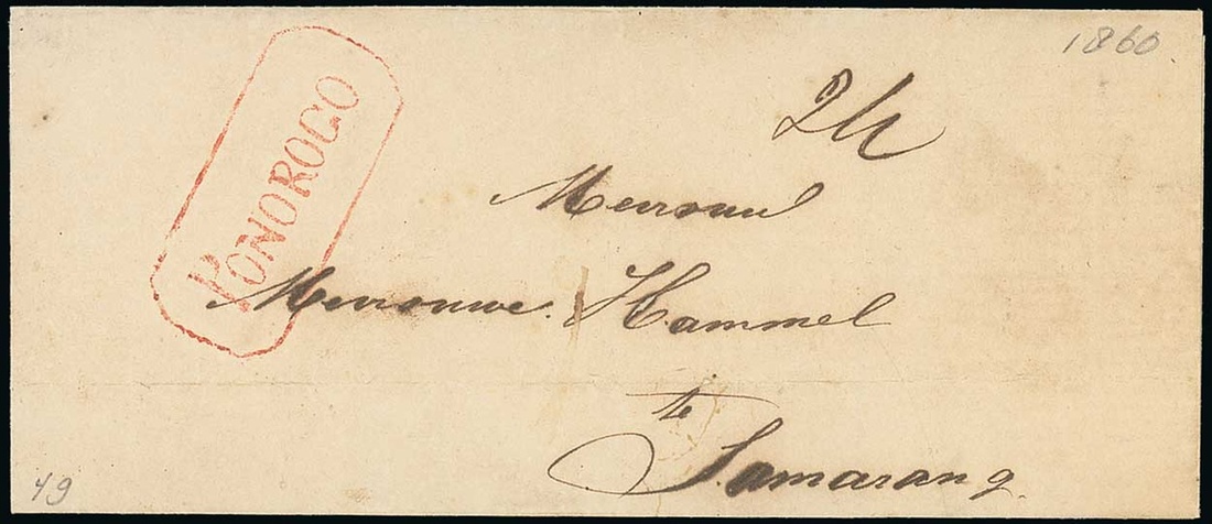 1860 entire to Samarang with red framed "Ponorgo" (Wolff De Beer 244c); fine. Photo