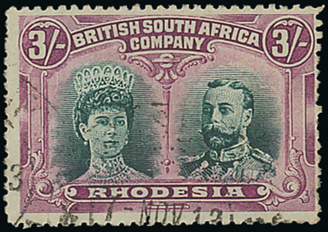 3/- bright green and magenta, lightly cancelled with two small part datestamps; some short/ragged perfs. at right, otherwise sound. Scarce. S.G. 158a, £850. Photo